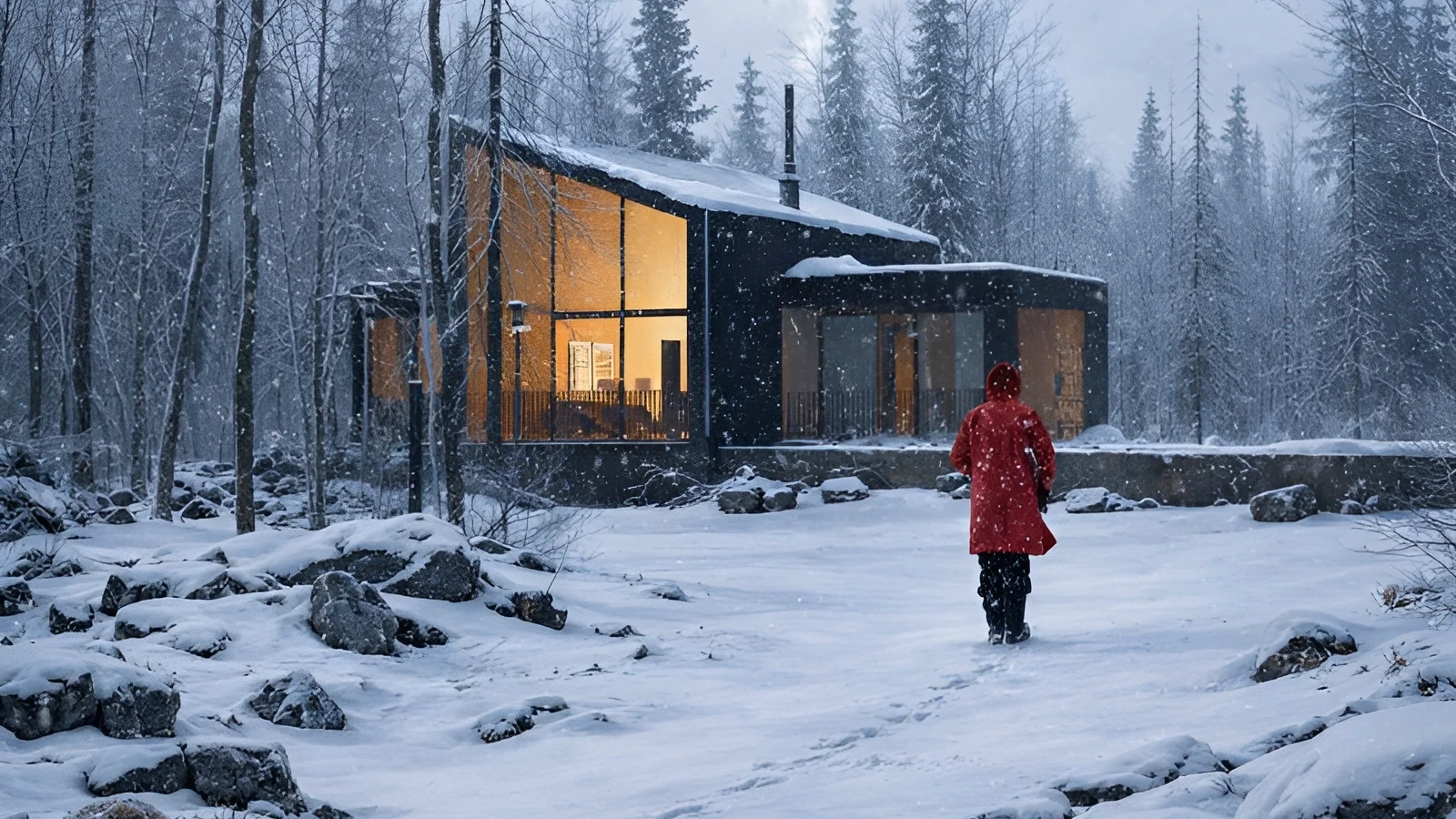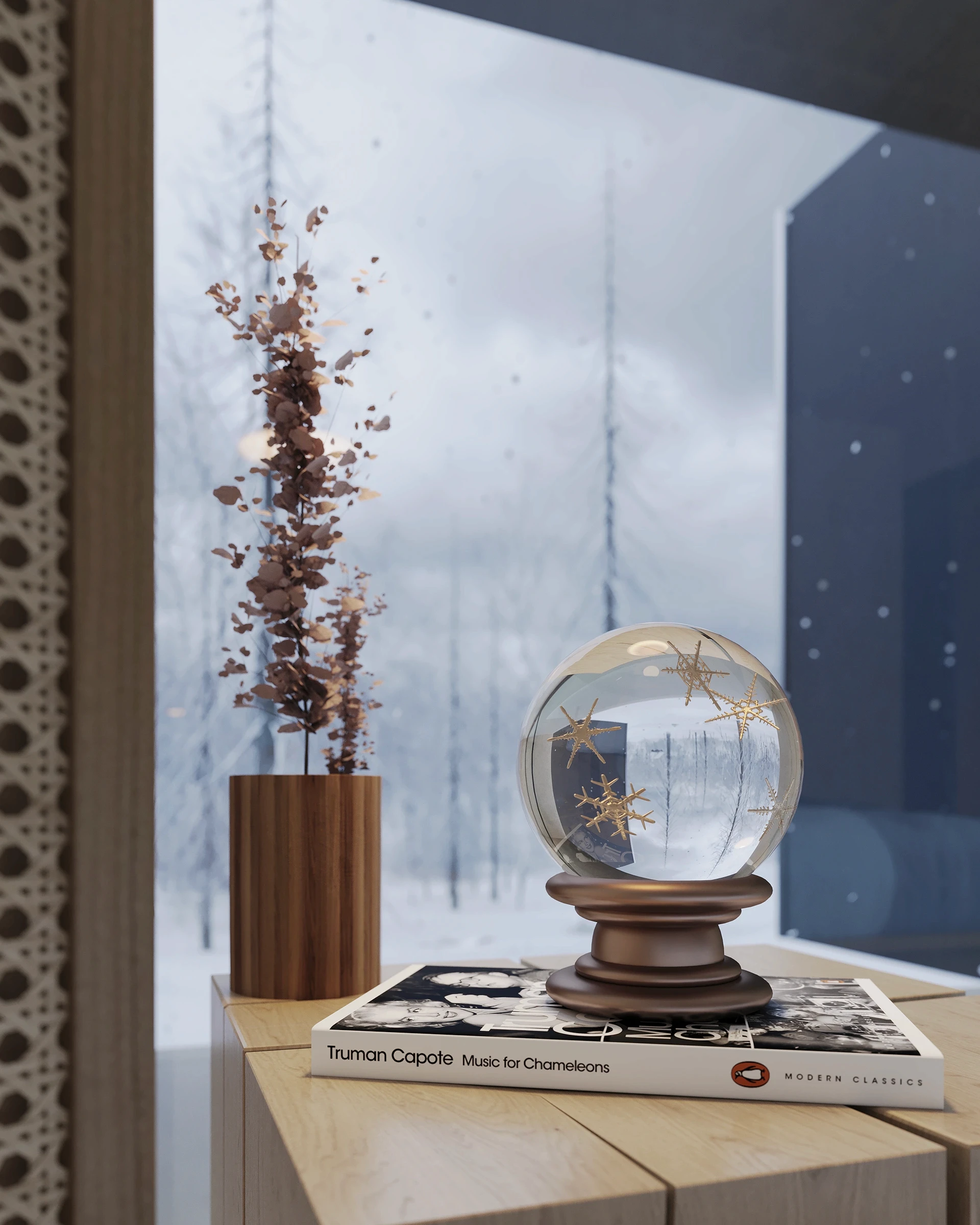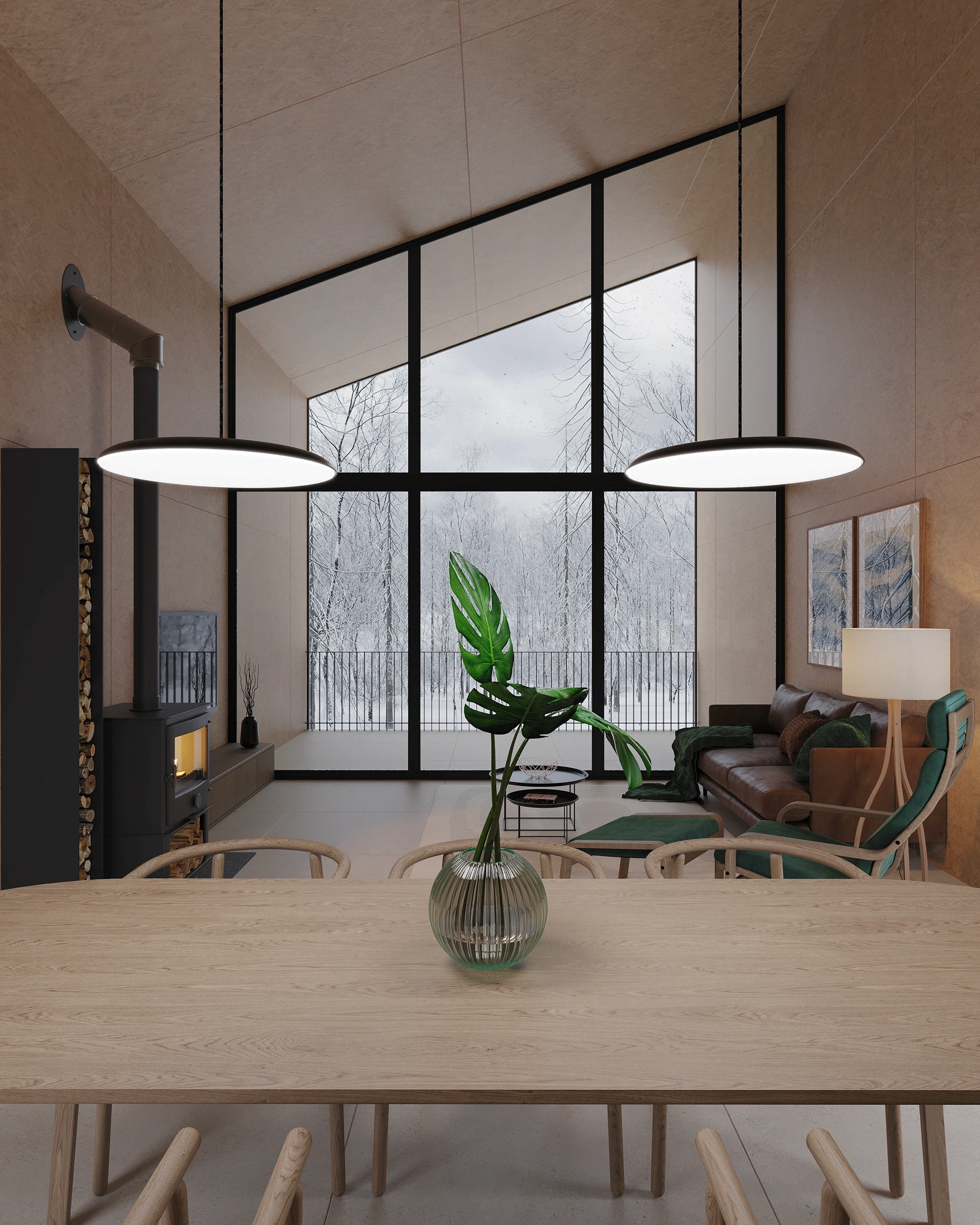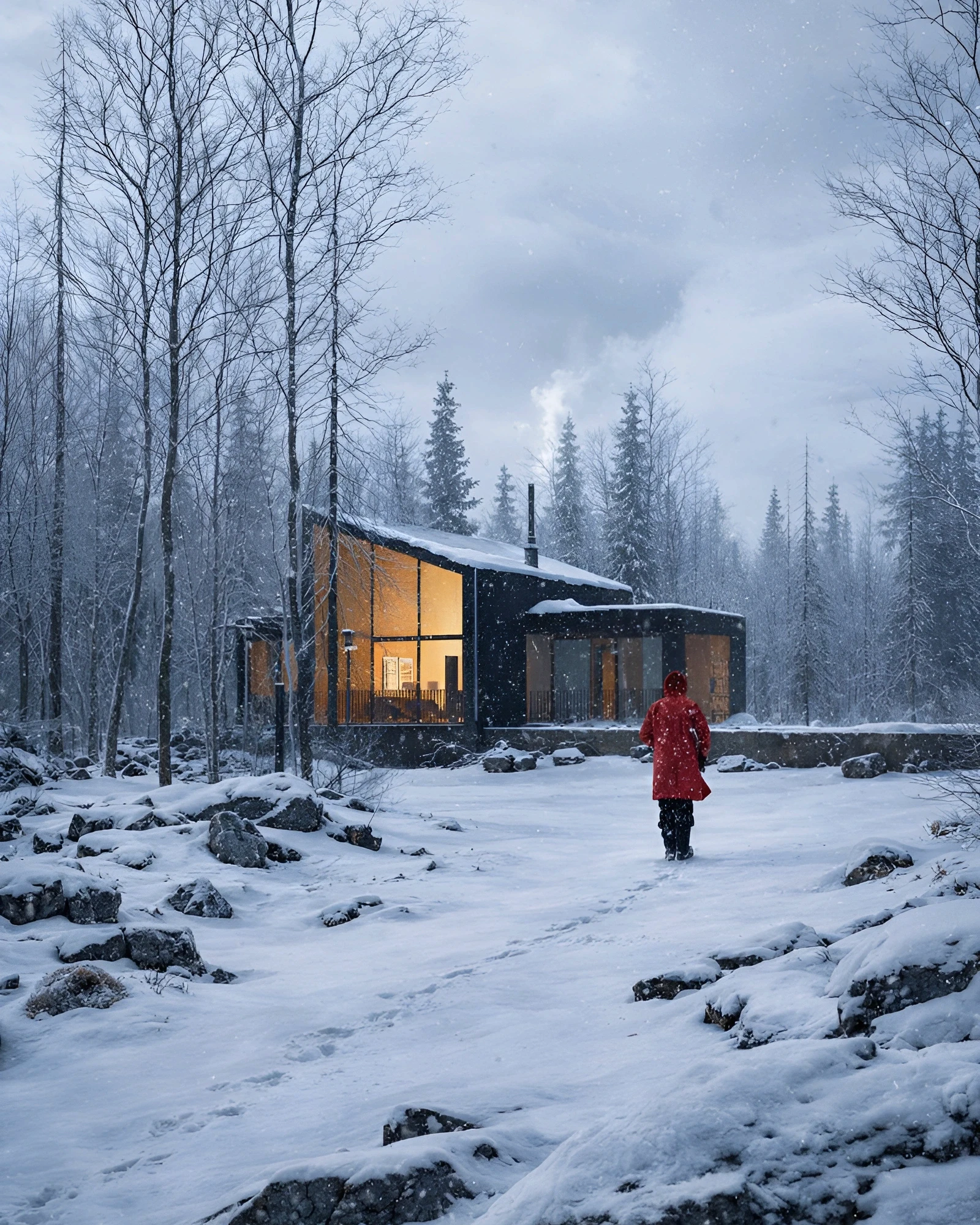 Amid the serene snowy landscape of Dornach, Switzerland, this residence was designed to provide comfort and a strong connection with nature. With contemporary lines and a striking volumetric composition, the house combines natural materials and large glazed openings to capture the beauty of the Swiss winter.The façade stands out for its minimalist and elegant composition, where the contrast between wood and metal structure reinforces the project’s modern identity. The large glass panel, framed by the sloped roof, allows a constant connection with the surrounding landscape, turning the exterior into an active part of the interior environment.The interior features a warm and inviting atmosphere, with natural wood finishes and earthy tones that enhance the sense of comfort. The social area is spacious and well lit, defined by its high ceiling and fireplace, which becomes the focal point during cold days. The furniture layout emphasizes comfort and functionality, while design elements add sophistication and harmony to the space.At night, the warm lighting and the glow of the fireplace create a beautiful contrast with the snow outside, transforming the house into a true winter retreat. Whether for contemplation, relaxation, or moments immersed in nature, this project captures the essence of a contemporary and elegant home, perfectly integrated into its alpine setting.